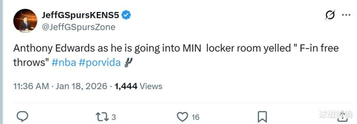比赛结束后能够看到爱德华兹满眼不甘,同时马刺队记JeffGSpursKENS5曝出赛后爱德华兹怒爆粗口:“去TMD罚球!”以表达对于自己丢掉关键罚球的不满。